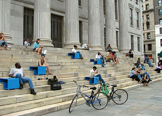 Stair Squares, a concept brought to life by artist Mark Reigelman, a self-proclaimed genius, are little blue tables that fit perfectly onto steps to offer little perches for eating and reading. The Stair Squares were installed on the front steps of Brooklyn’s Borough Hall in the summer of 2007 on temporary basis.